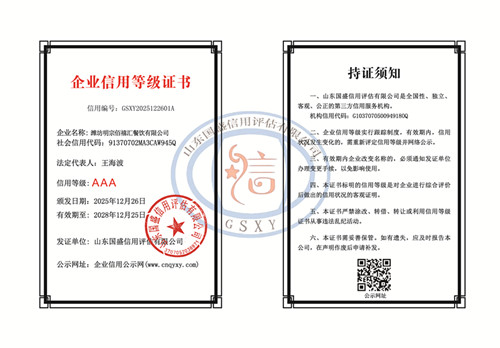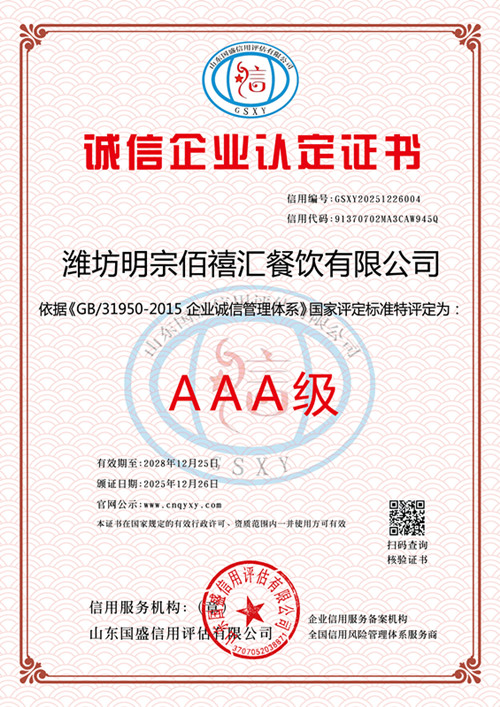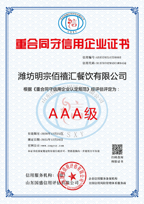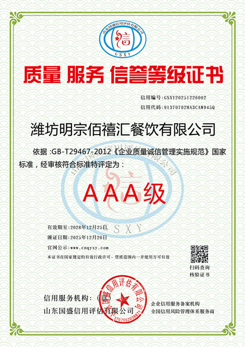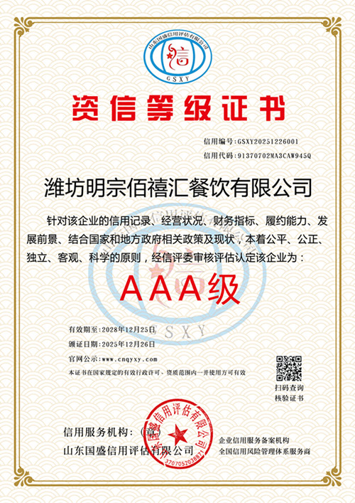 潍坊明宗佰禧汇餐饮有限公司: 受贵单位委托,《国盛信用》根据国际通行法律原则和中华人民共和国法律、行政法规规定,依据 GB/T CCA9002 企业信用评价标准(国家级行业标准)、《征信业管理条例》进行企业信用认证。我们根据企业的财务状况、组织运营、信用表现、外部影响共四大模块的 16个细分维度实施了大数据采集及初步评审,并在此基础上结合企业提交的最新年度资料,进行财务审核,专家复审等必要的评审程序;最终认定: 贵单位信用等级 AAA 级。我们将在服务期内对贵单位的信用状况保持密切关注,并在必要的情况下及时揭示受评对象可能出现的信用水平变化。